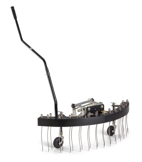 Első gereblye (MCS* Multi Connect System) fűnyíró traktorokhoz. 110 cm munkaszélesség. A sűrű fű egészségesebbé és dúsabbá tételére tervezték. Ez a gereblye ívelt fogakkal rendelkezik a felület optimális tisztítása érdekében.
